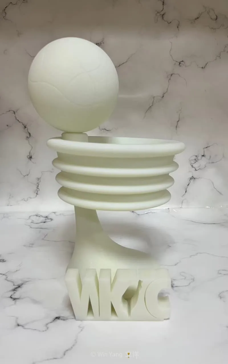 將合球比賽中「籃框」的造型延伸到整體客製化獎盃,在電腦中繪製3D模擬圖,再用3D列印獎盃技術將實體製作出來,客製化獎盃的底座選擇深色胡桃木色,搭配金色籃框,最後放上「WKC」文字,並且在文字中間加入台灣樣貌,整體看起來典雅又精緻。