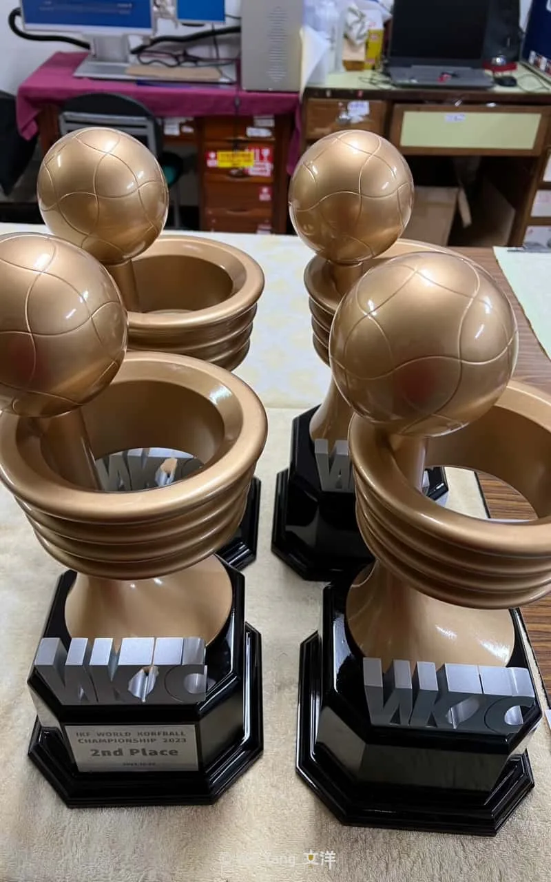 2023臺北第12屆IKF世界合球錦標賽,文洋獎盃團隊身為官方贊助單位之一,接到了一個「挑戰」!從設計發想、打樣到最後製作出客製化獎盃,僅僅只有14天的工作期,因此靠著過去客製化獎盃設計的豐富經驗在最短的時間內完成客製化獎盃設計一條龍的服務。