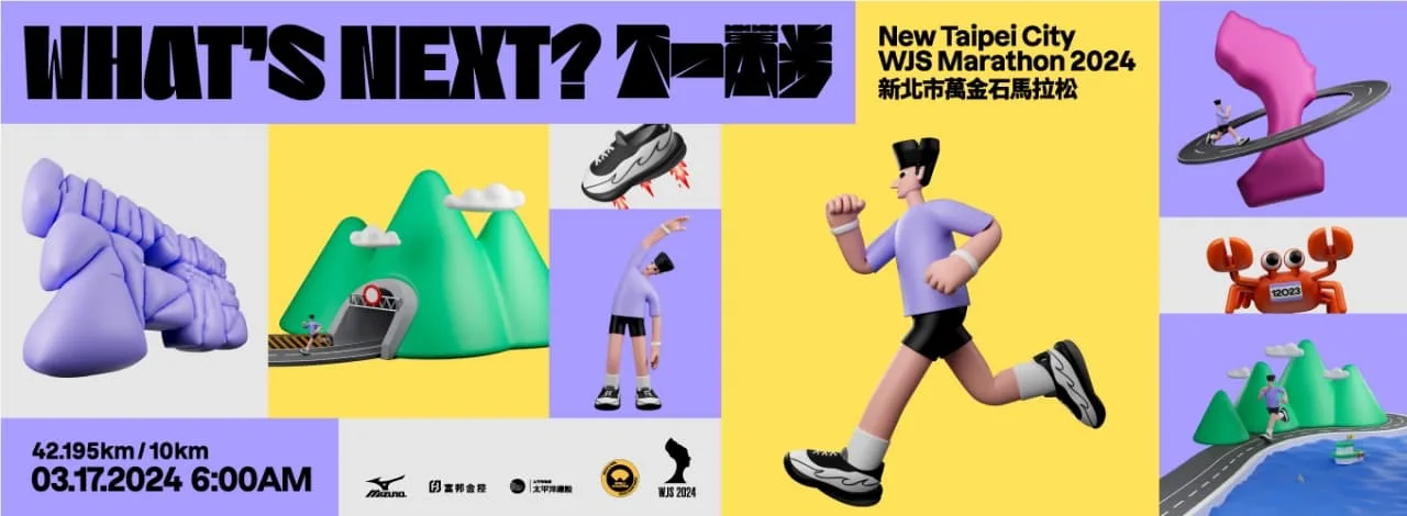 2024萬金石馬拉松的主視覺延續「下一萬步」的精神,與曾獲德國iF設計獎的設計師彭冠傑合作,將萬里隧道、女王頭、在地的景觀與食材利用「3D動畫」方式呈現,帶給跑者全新不同的感受。