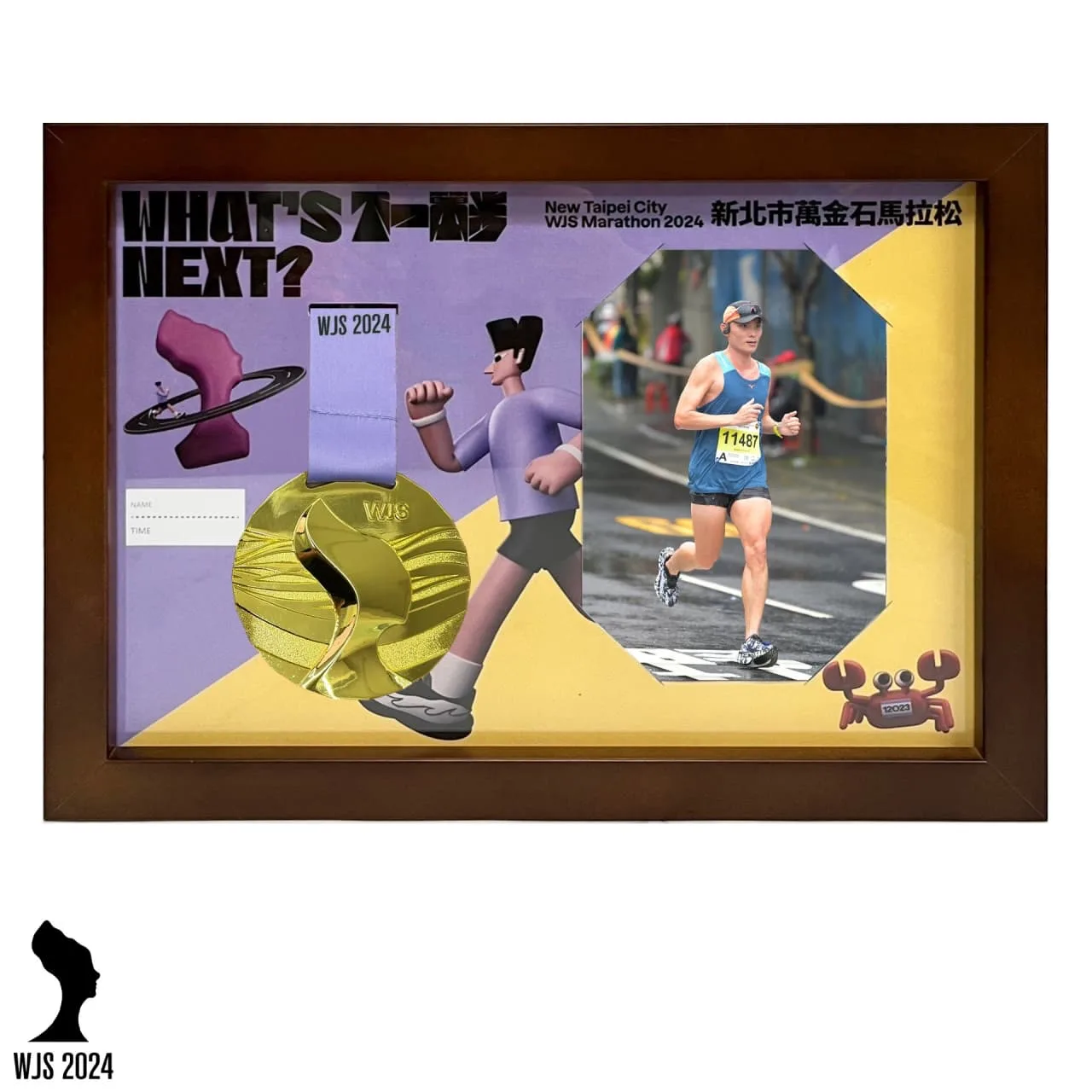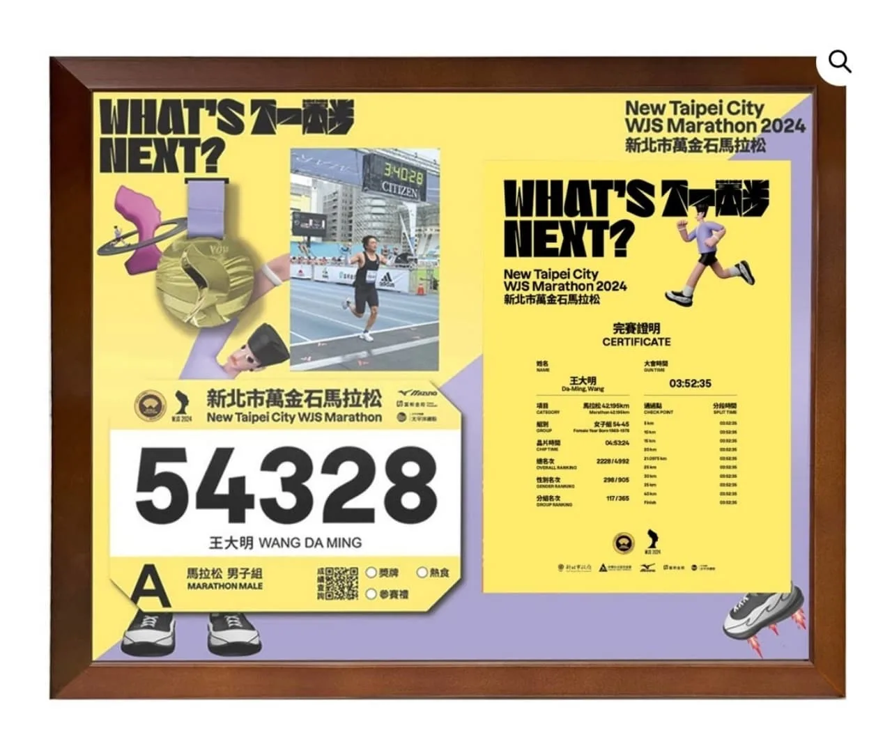 完賽紀念相框,第一種是大型收納框,可將完賽獎牌、照片、完賽成績證明、號碼布通通裱框掛在一起。