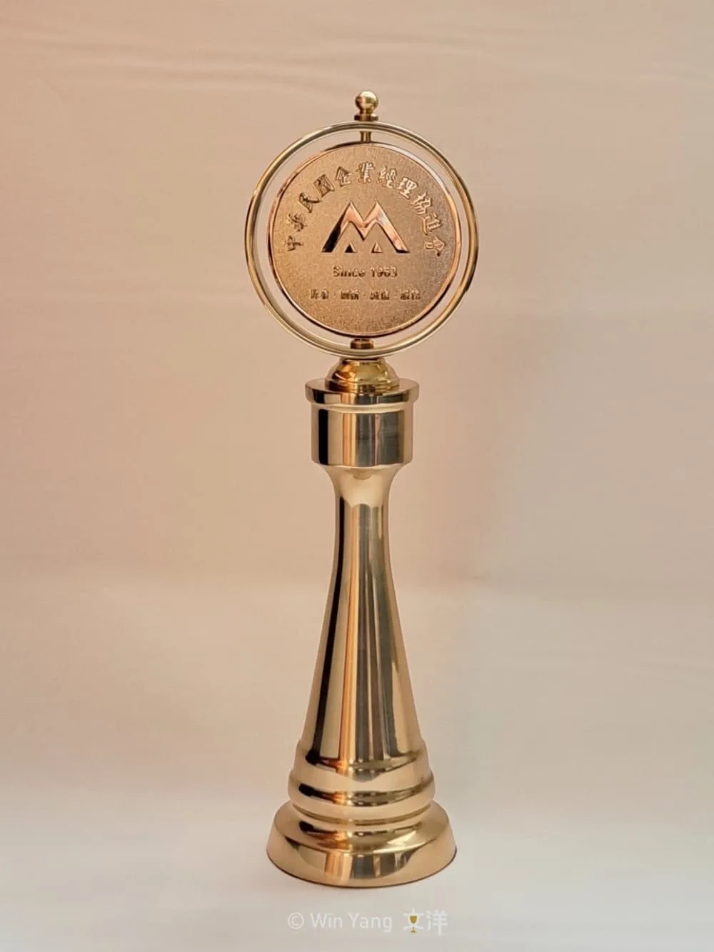 文洋團隊很榮幸製作中華企經會2022年度的客製化獎盃,獎盃造型採用經典的金鐘旋轉獎座,燈塔式的弧型線條,十分優雅。貴金屬黃銅鑄造開模,表面採用18K金電鍍,18K金的硬度比起其他貴金屬高,較能抵抗磨擦刮花,整體客製化獎盃重量落於1.5KG左右,手持起來有份量感,屬於穩重、尊榮感十足的款式。