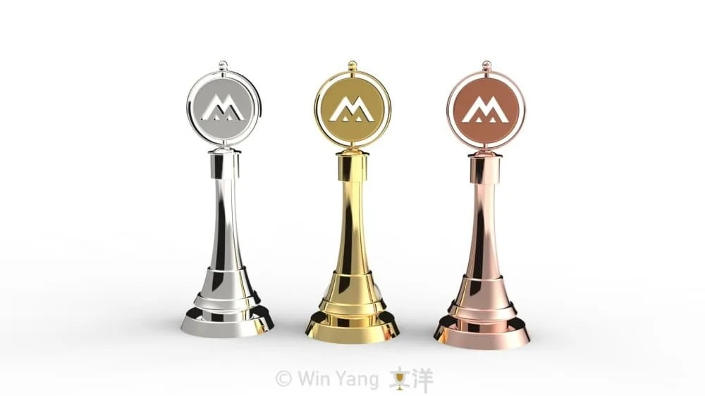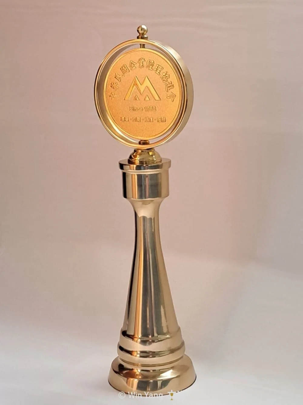 2022年的中華企經會客製化獎盃中心使用旋轉軸心,可以任意翻轉,因為是客製化開模製造,除了logo、文字量身打造,也能依造不同的獎項電鍍不同金屬色澤。