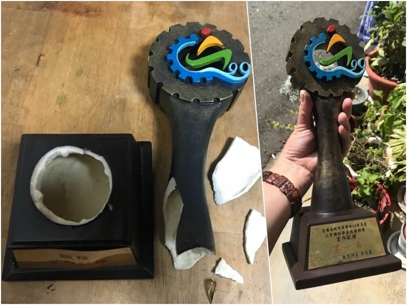 ▼摔壞的獎盃像拼圖一樣,將片片碎片膠合黏貼起來