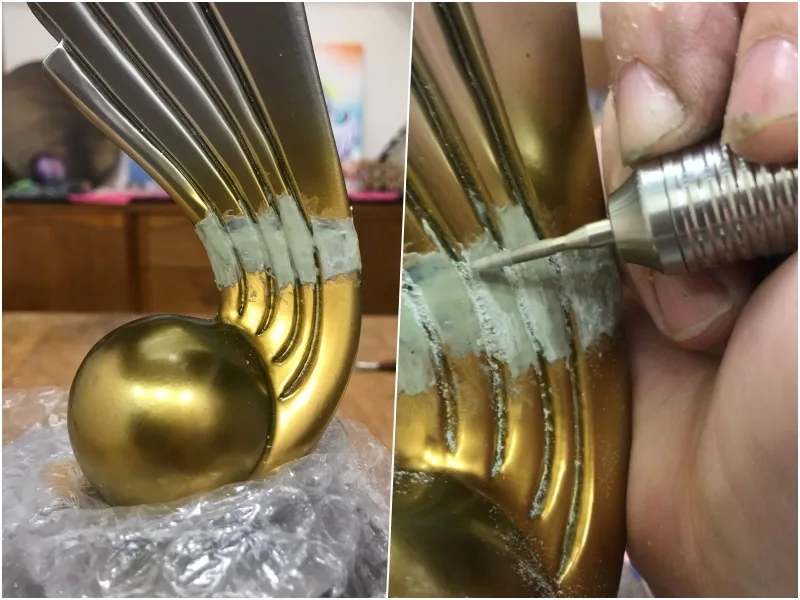 就像是柏油路上坑坑疤疤,用瀝青將洞補好填平一樣,利用補土動作,將原本獎盃上的坑洞、裂痕填平,再經過磨砂處理,讓獎盃表面及造型摸起來光滑順手。