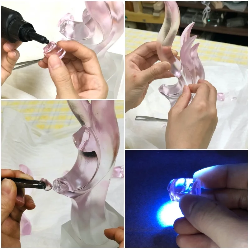 依據不同的材質特性,使用不同的膠合劑黏著固定,復原斷裂破損的獎盃外貌。
