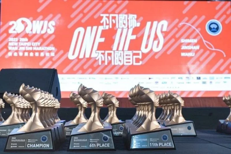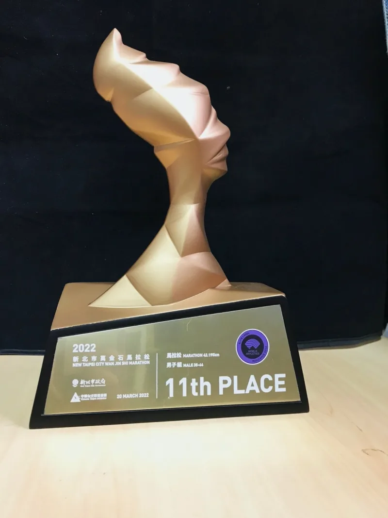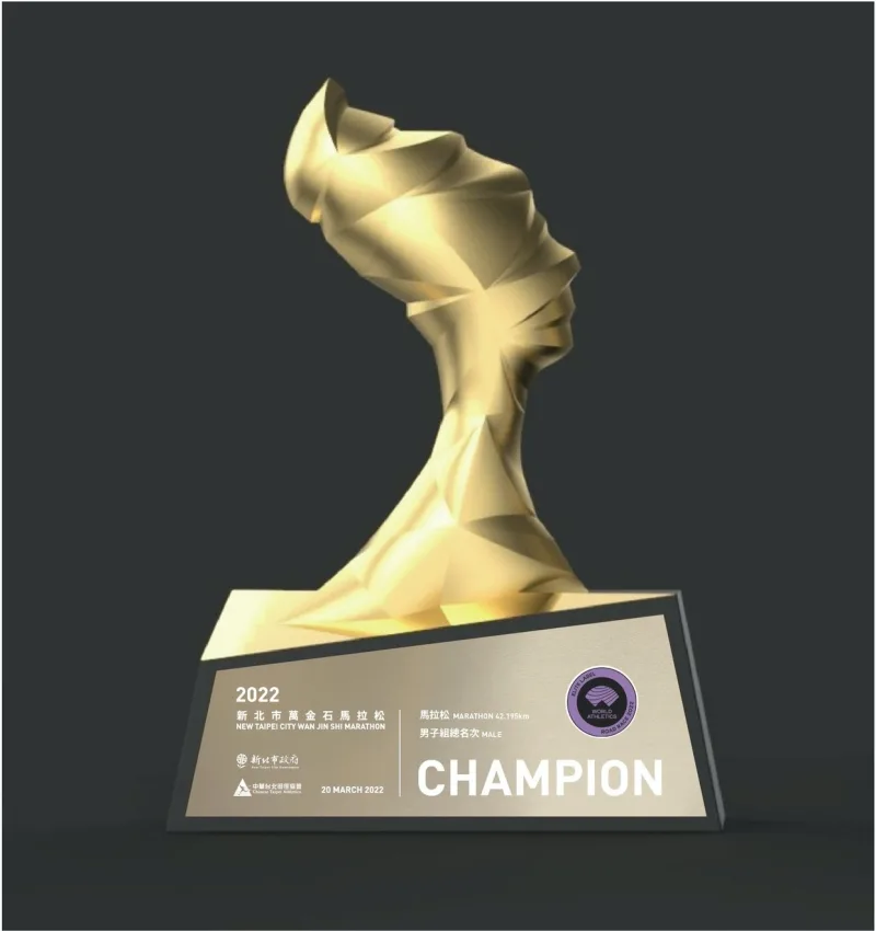 今年升格成為菁英標籤賽事,不管是邀請制度、賽道管制、防疫規格、運動賽事獎盃設計皆盡善盡美,也朝著未來的金標籤、白金標籤前進。因此今年的萬金石馬拉松客製化獎盃特別選用「金色」作為主軸,將全馬賽道蜿蜒的海岸路線結合女王頭的線條;而底座則採用不規則形狀呼應沿海賽道會遇到的強風、崎嶇路線、烈日曝曬等困難。