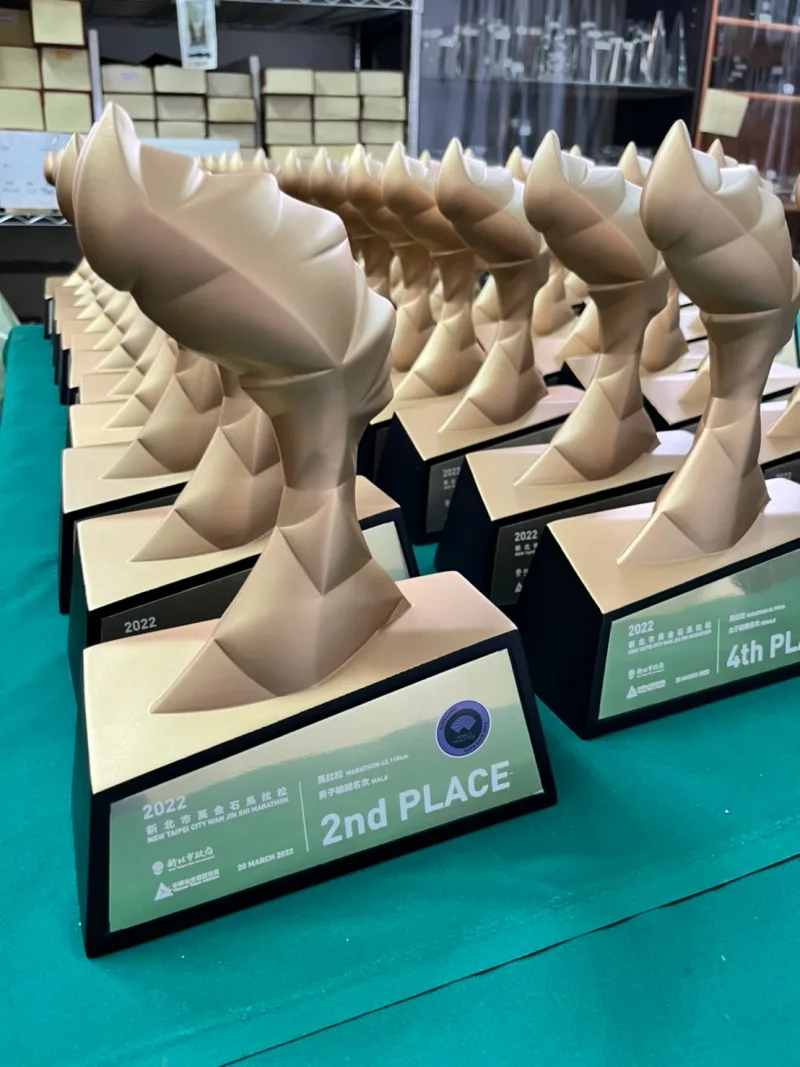 萬金石馬拉松客製化獎盃設計的材質使用3D列印後翻模製作,合成石底材增加獎座的份量感,手工層層上金漆處理。不規則的底座正面搭配金屬電鍍鋁板,黑金色獎座,看起來時尚又前衛,廣受好評。
