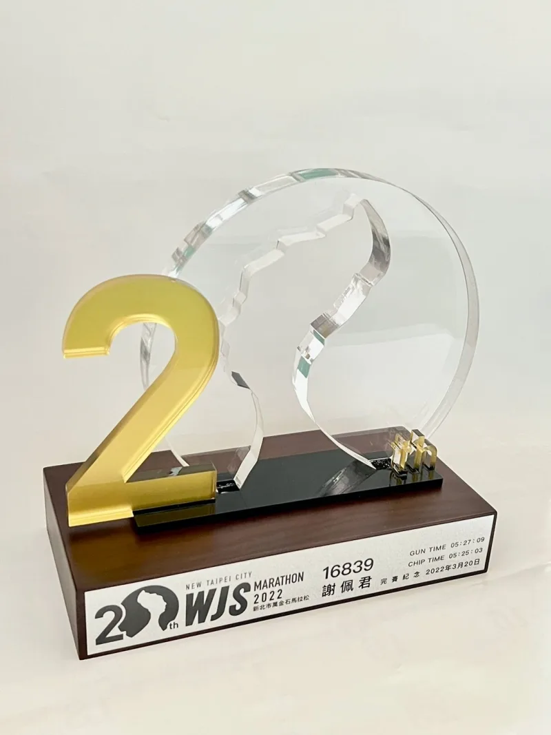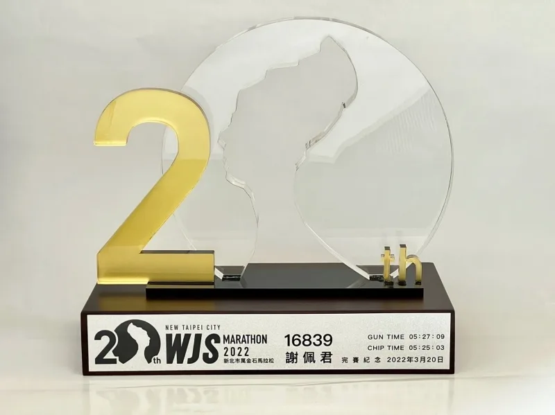 輕透感壓克力刻劃出20的造型,在圓形透明壓克力下,利用鏤空的手法,將女王頭穩坐在台灣實木的底座上。讓每一位參賽者在報名時選購,會在馬拉松賽事的完賽時,共同留下回憶,特別是針對一生只有一次的初馬跑者,添購完賽獎盃更具有紀念收藏意義。