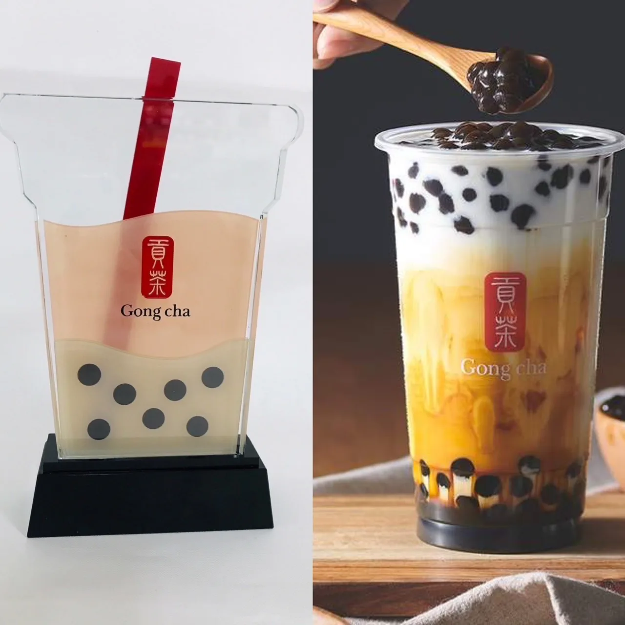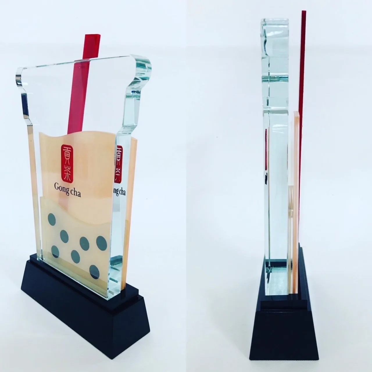 我們使用UV直噴印刷, 相較傳統印刷方式,UV印刷的好處是透明光的油墨,除了可以讓印刷部分有不一樣的質感,透明墨也有防水防刮防褪色 的特性,可保護印刷部分。獎盃上畫龍點睛的紅色吸管跟Logo也是多次人工調色,成為現在所看到的經典貢茶紅。獎盃的底座則採用低調尊貴的K9料黑水晶,拿起來沈穩大器。
