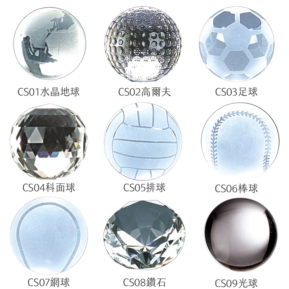 水晶地球, 水晶高爾夫, 水晶足球, 水晶科面球, 水晶排球, 水晶棒球, 水晶網球, 水晶鑽石, 水晶光球
